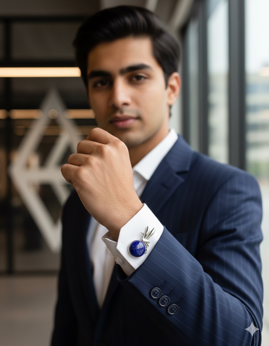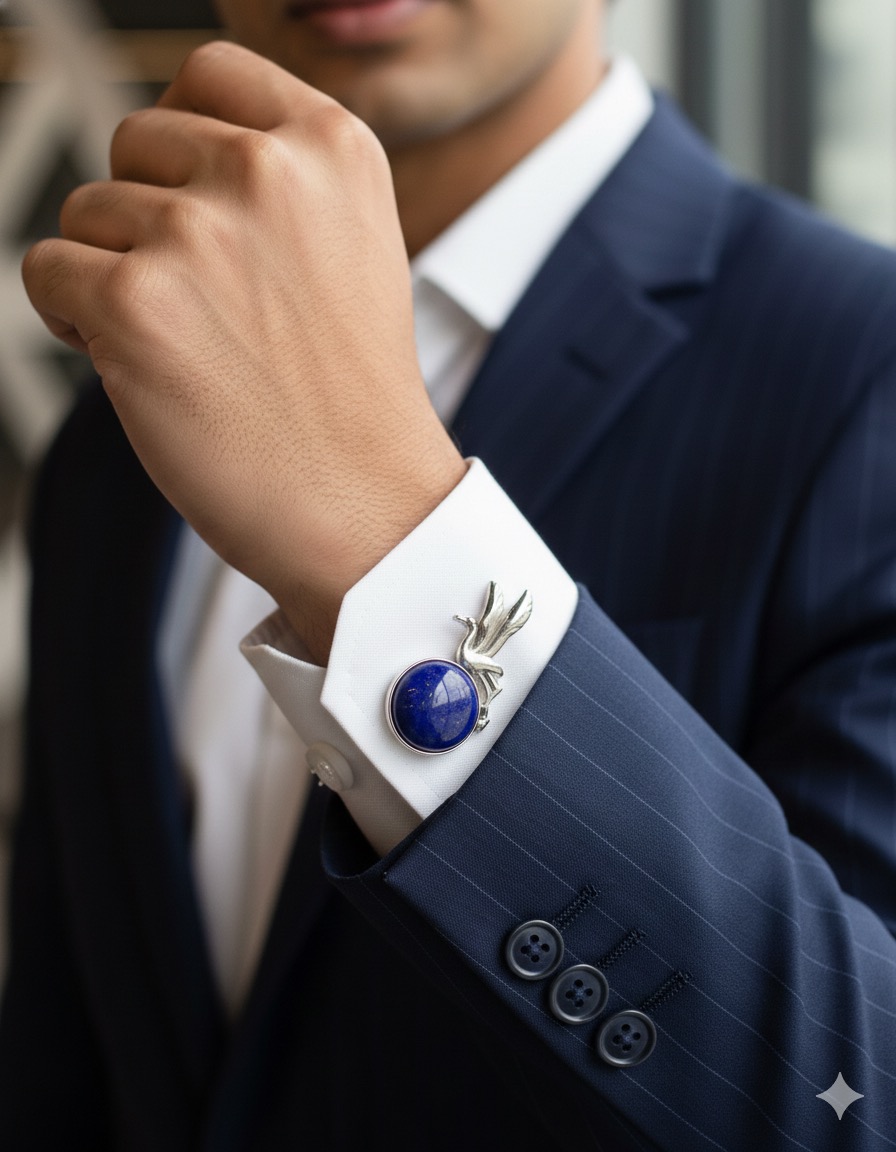 Majestic Gemstone: The base of the design features a perfectly polished, deep blue Lapis Lazuli cabochon. Known for its rich color and subtle golden pyrite flecks, Lapis Lazuli has been prized by royalty for centuries, lending an air of regal distinction to your cuffs.