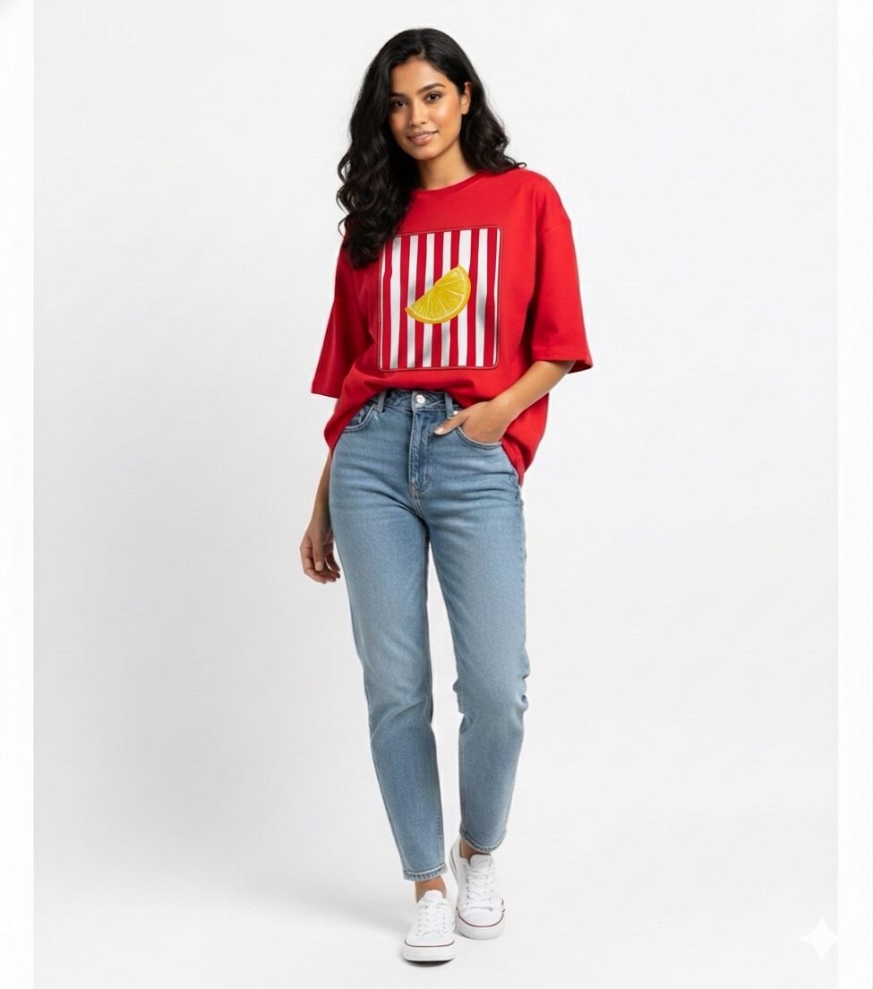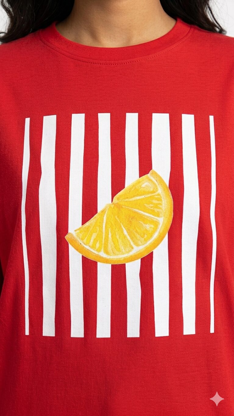 Bright, bold, and undeniably zestful, the Lemon Stripes tee is a masterclass in high-contrast design. Featuring a detailed,  Digitally printed lemon slice centred over a series of crisp, vertical white stripes, this piece pops against its vivid cardinal red base for a look that feels both retro and remarkably modern.