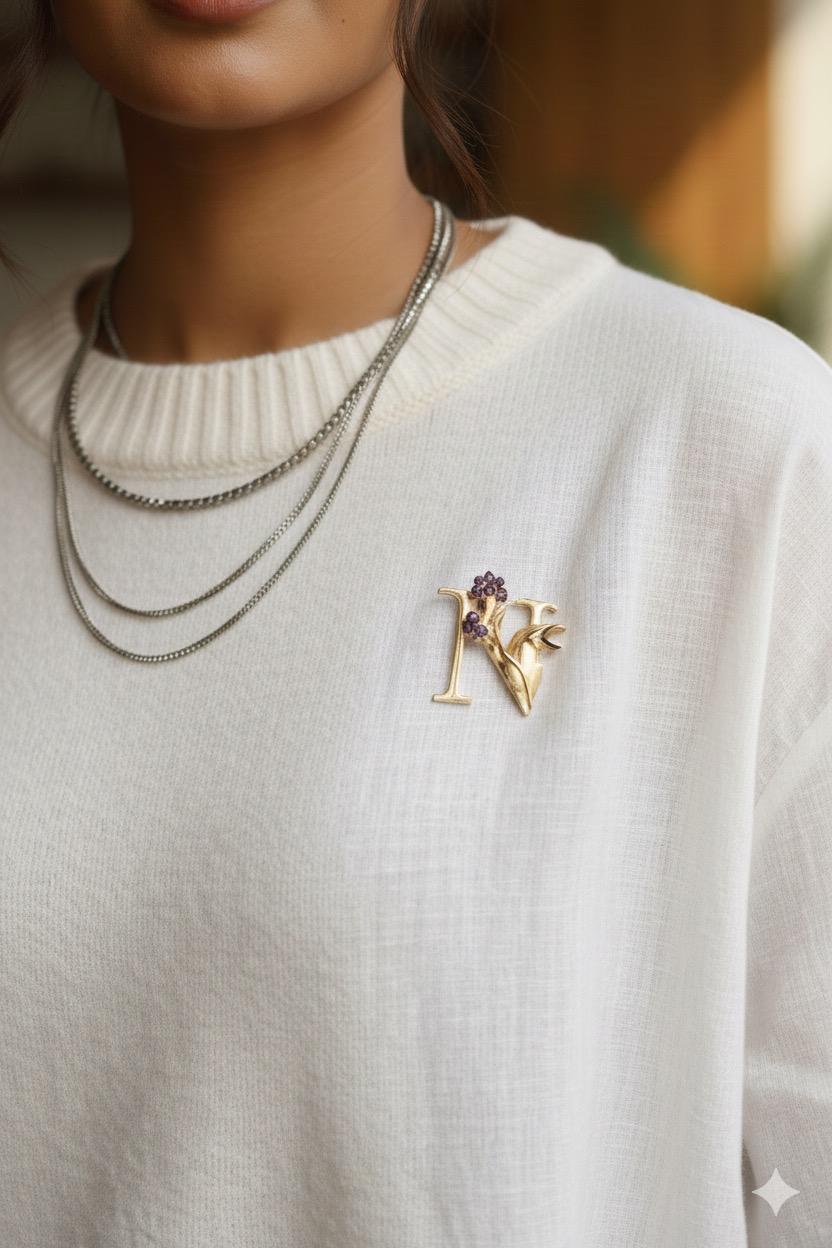 The Nightingale’s Song ‘N’ Brooch is an exquisite piece that tells a story of elegance and natural beauty. This unique accessory combines the personal significance of an initial with the delicate artistry inspired by the world’s most melodious bird.