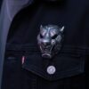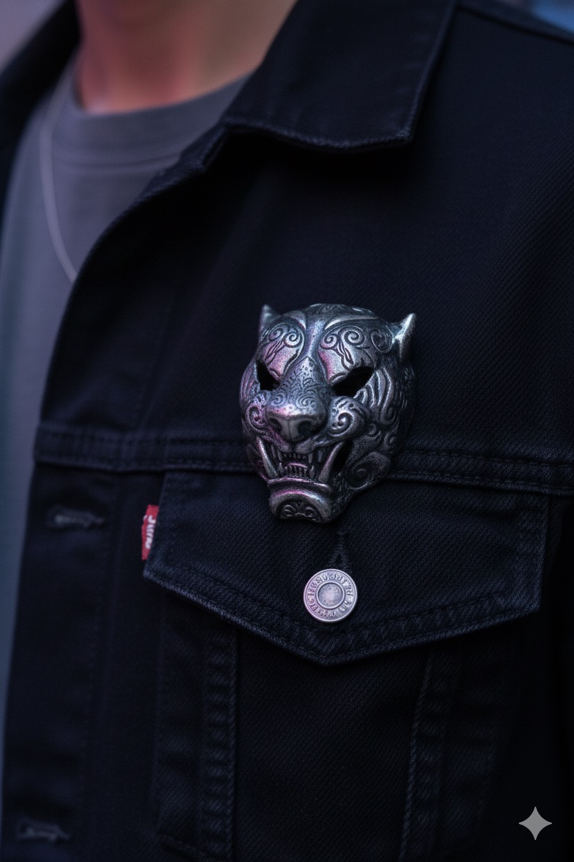 Unleash a powerful sense of history and intensity with the Raging Spirit Brooch. This highly detailed piece is inspired by the formidable Tiger Menpo (Japanese warrior mask), featuring intricate swirling etchings, menacing fangs, and a truly awe-inspiring expression. The deep, oxidized finish enhances the textural complexity, making the mask leap out with dramatic depth.