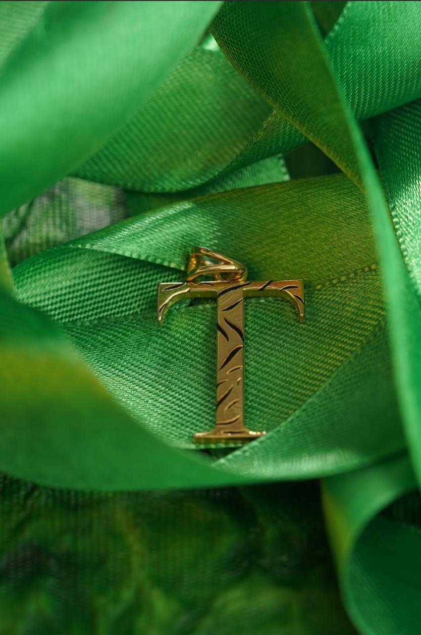 The design transforms a simple initial into a work of art. The bold, sculptural letter ‘T’ is distinguished by deep, engraved tiger stripes running down its length, creating an effect of fluid motion and raw power.