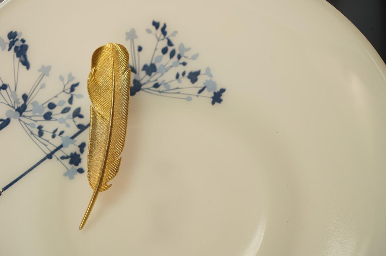 Perfect for adding a sophisticated, ethereal touch to any ensemble. Pin it to the lapel of a tailored blazer, use it to accent a scarf or hat, or wear it on a dress to draw the eye with its sweeping, elegant form. The Golden Plume Brooch is a classic piece that never goes out of style.