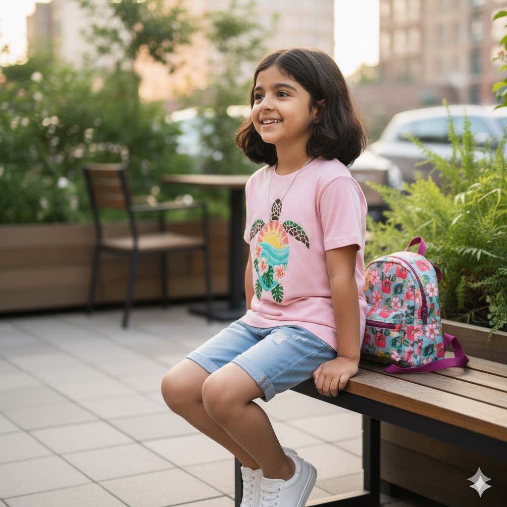 Where Artistry Meets Everyday Play. Let your little explorer set sail on a sea of comfort. Featuring a vibrant, hand-stitched turtle carrying a slice of paradise on its back, this t-shirt brings a splash of tropical magic to any wardrobe. Every stitch is a labor of love, making each piece as unique as the child wearing it.