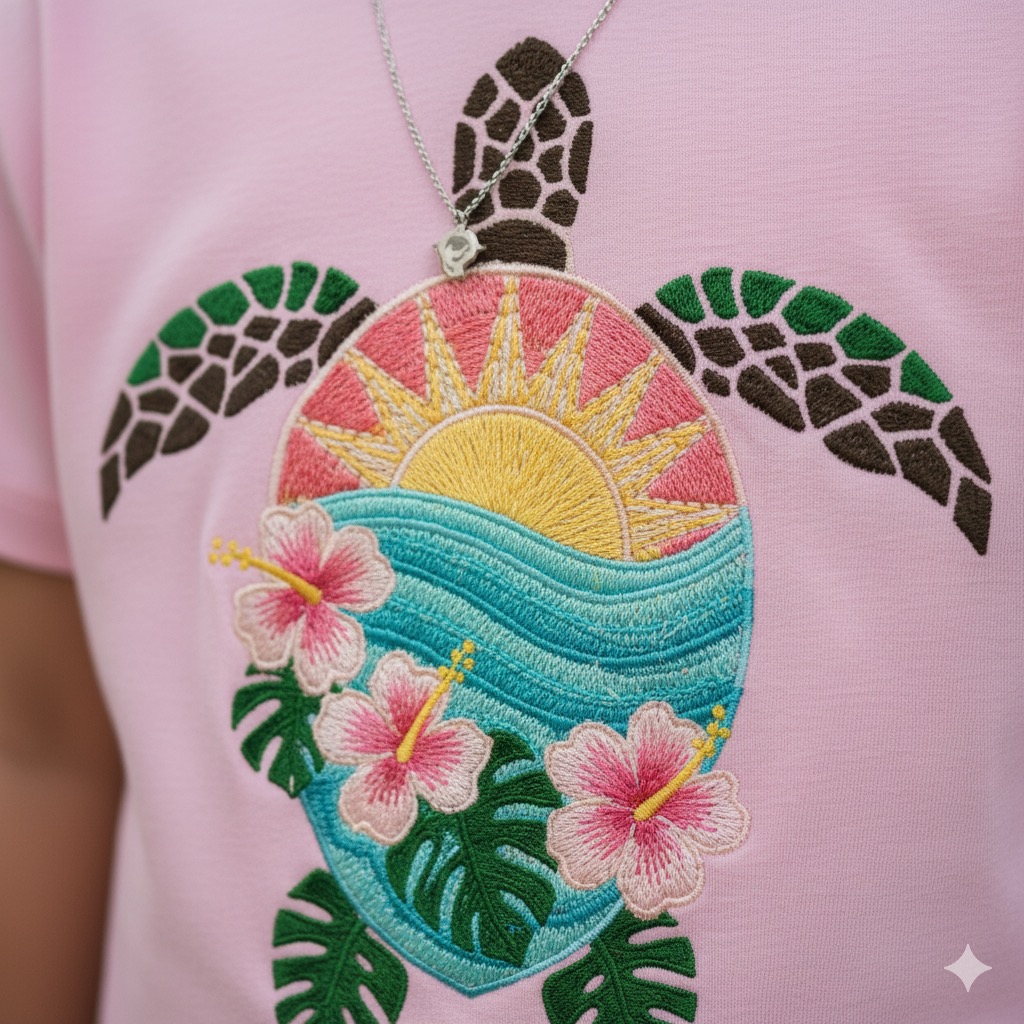 • Artisanal Hand-Embroidery: No mass-produced prints here. The intricate turtle, hibiscus, and sun design are meticulously embroidered by hand for a textured, premium look that lasts.