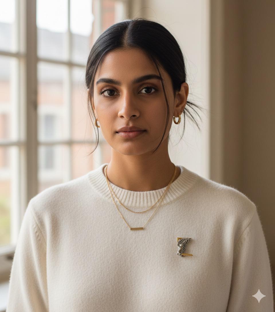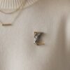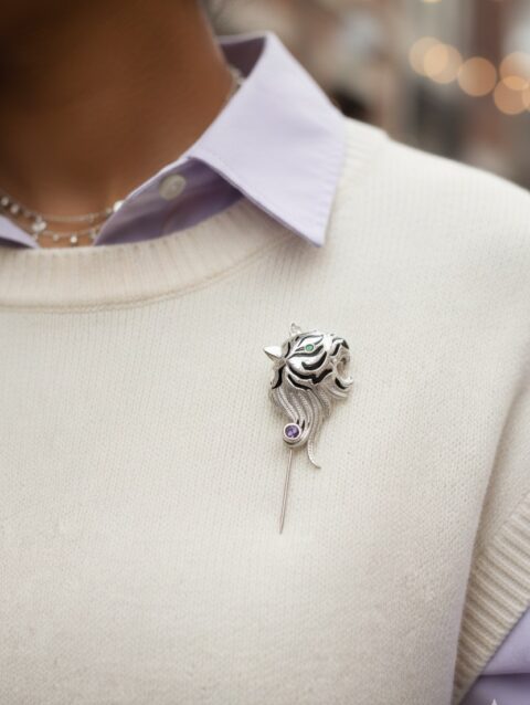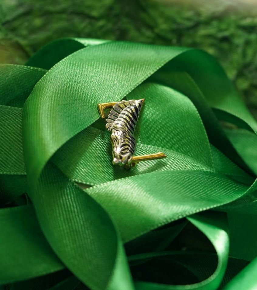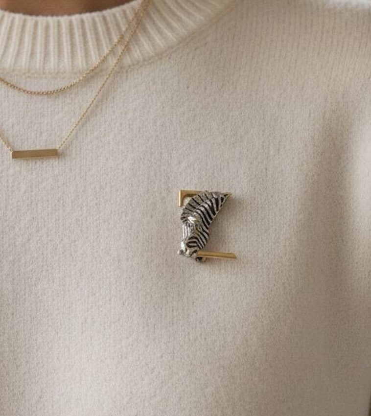 The brooch is meticulously designed, featuring a striking letter ‘Z’ that is dynamically filled with the etched lines of zebra stripes. This bold texture catches the light and adds a captivating dimensionality to the design.