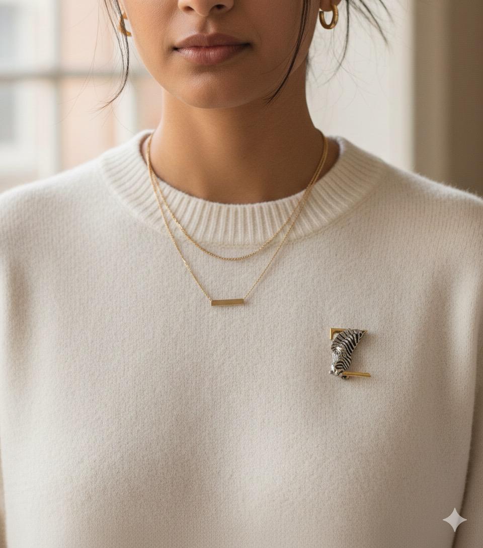 Make a bold statement with the Zestful Zebra Brooch, a high-fashion accessory that captures the exhilarating spirit of the wild. This piece brilliantly fuses the sleek structure of the initial ‘Z’ with the electrifying patterns of the zebra, resulting in a unique wearable work of art.